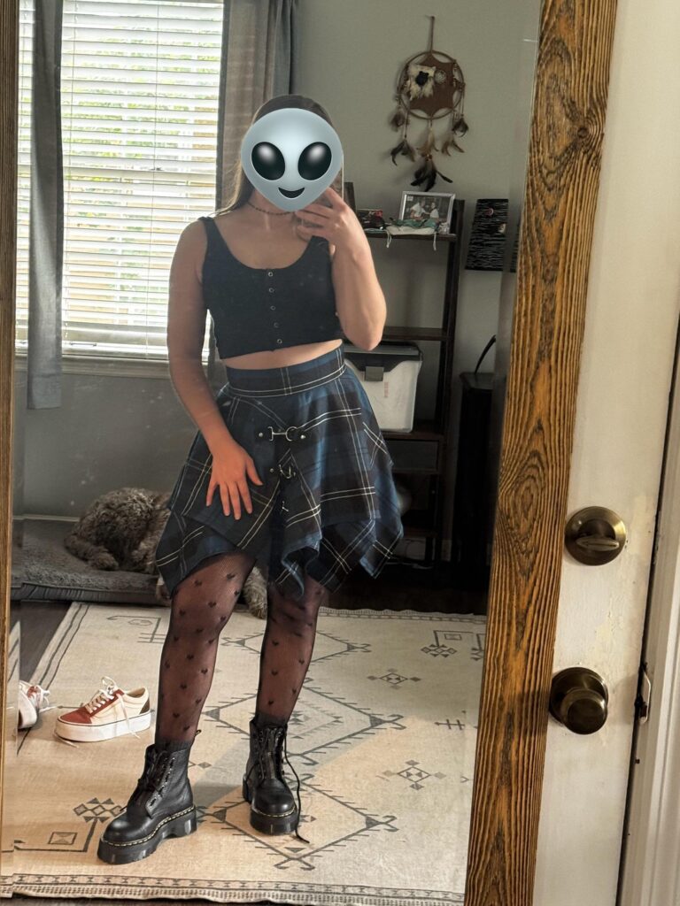 Usually plaid feels costumey but paired with dark tights and combat boots it reads genuinely alternative.