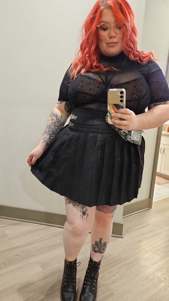 It’s feminine and dark at the same time, which is the whole metal fashion sweet spot. The buckle detail on the skirt waistband is such a good touch.