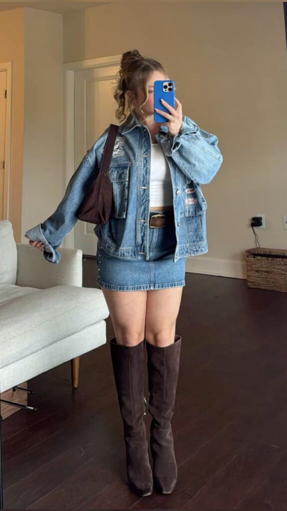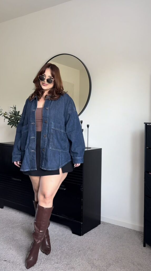 Sometimes the most low effort combination hits the hardest. Oversized dark denim shacket over a mocha crop top with a black mini skirt and tall brown leather boots reads so cool without being loud about it. The small oval sunglasses finish this off perfectly. For a Nashville dinner or an early evening bar hop this look is basically guaranteed to photograph well in every single spot.