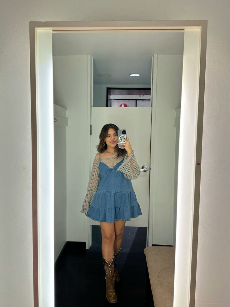 Red lace long sleeve under a light denim dress with stacked silver chains, a rodeo trucker cap and black cowboy boots is so perfectly over the top in the best way. The red peeking through the denim neckline creates such a cool contrast. This is the kind of Nashville look that gets compliments at every bar you walk into, so be prepared for that.