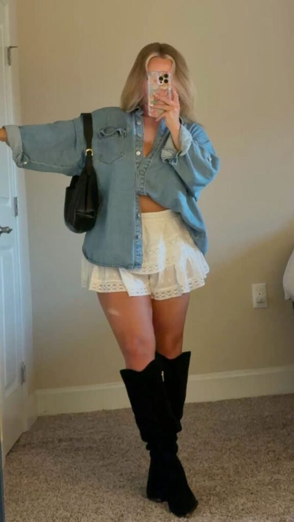 That oversized denim shirt left open and barely buttoned over a delicate cream lace mini skirt with tall black boots is giving effortless Nashville night out energy. The contrast between the slouchy top and the feminine skirt underneath is so good. This is honestly one of those outfits that looks better in person than in photos, which is saying something. You ought to try this combination immediately.