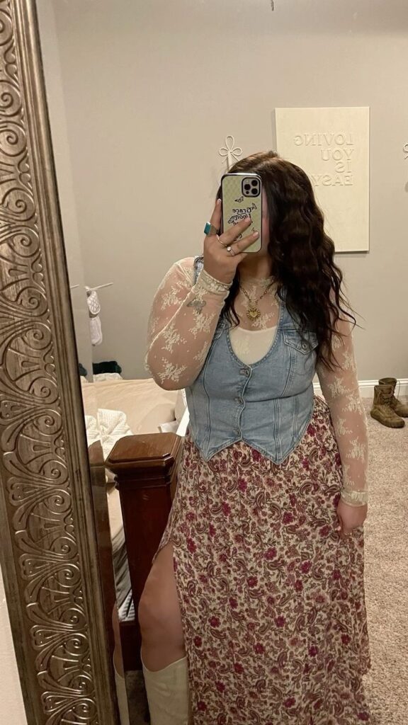 Okay so the combination of a sheer floral lace top layered under a fitted denim vest with a floral maxi skirt and white cowboy boots is giving full cottagecore country and I mean that in the best way. The gold heart necklace adds just the right amount of warmth. This is the look for a more relaxed venue or an outdoor festival stage where the setting matches the dreamy energy.