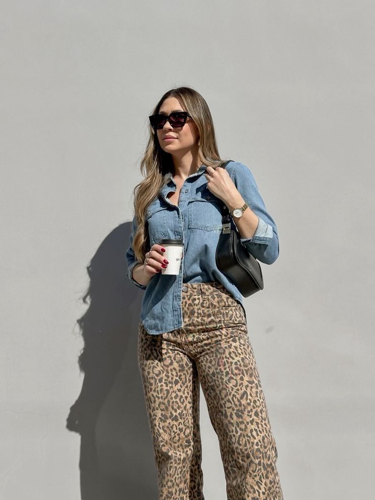 Denim Shirt, Leopard Pants, Coffee in Hand