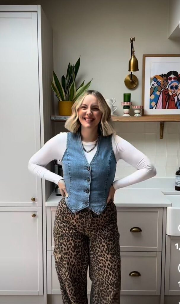 Layering a fitted denim vest over a white long sleeve with leopard cargo trousers sounds like it could go wrong. It doesn’t. The vest cinches everything and adds that structured country adjacent detail that makes the whole combination work. So great for a daytime Nashville itinerary where you want to look put together without trying too hard. Add a layered necklace and you are literally done.