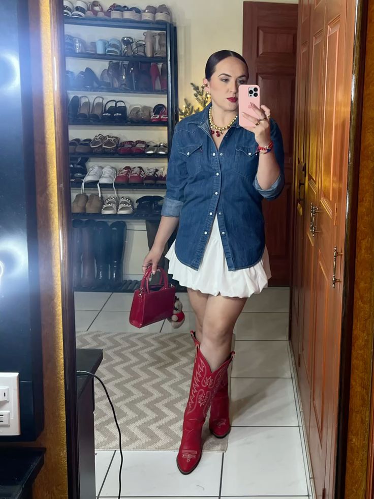 Red cowboy boots with a denim shirt and a white bubble skirt is such a fun, confident take on Nashville style. The stacked pearl necklaces and matching red bag add so much personality without overdoing it. This is the outfit for someone who knows how to commit to a look fully. So bright, so unapologetic, and honestly so fun to wear out on Broadway.
