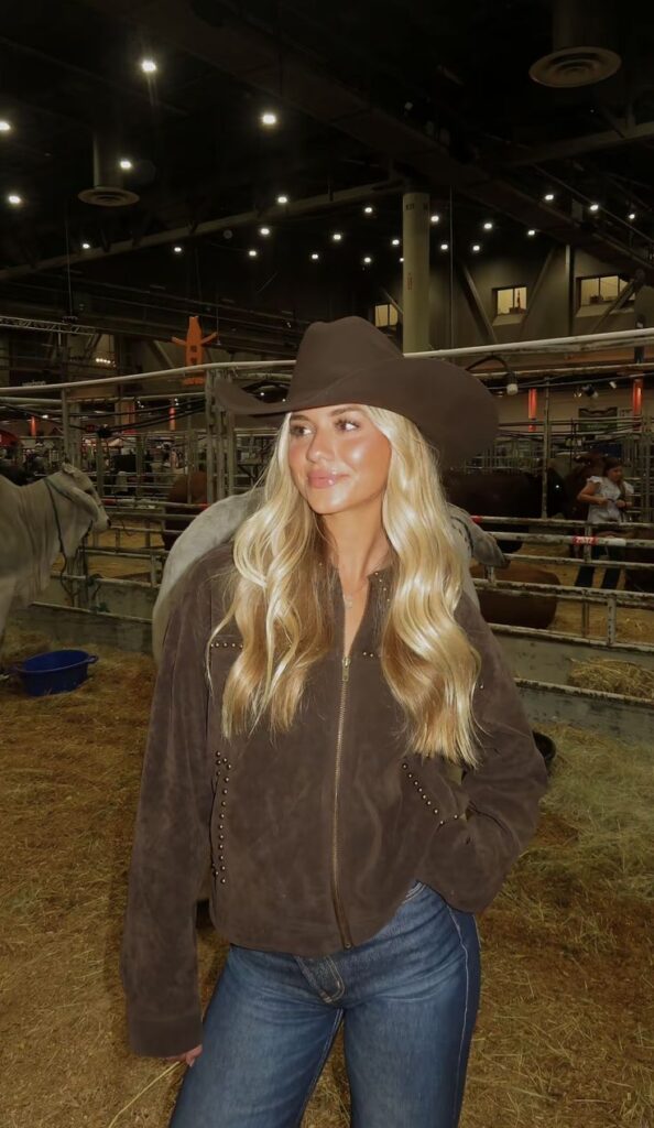The chocolate brown studded suede jacket with a matching wide brim cowboy hat and straight leg jeans is so straightforward it almost feels unfair. No fuss, no overthinking, just a rich warm toned jacket and a hat that does the rest of the personality work for you. This is the ideal rodeo or outdoor venue look when you want to feel country without dressing in a costume.