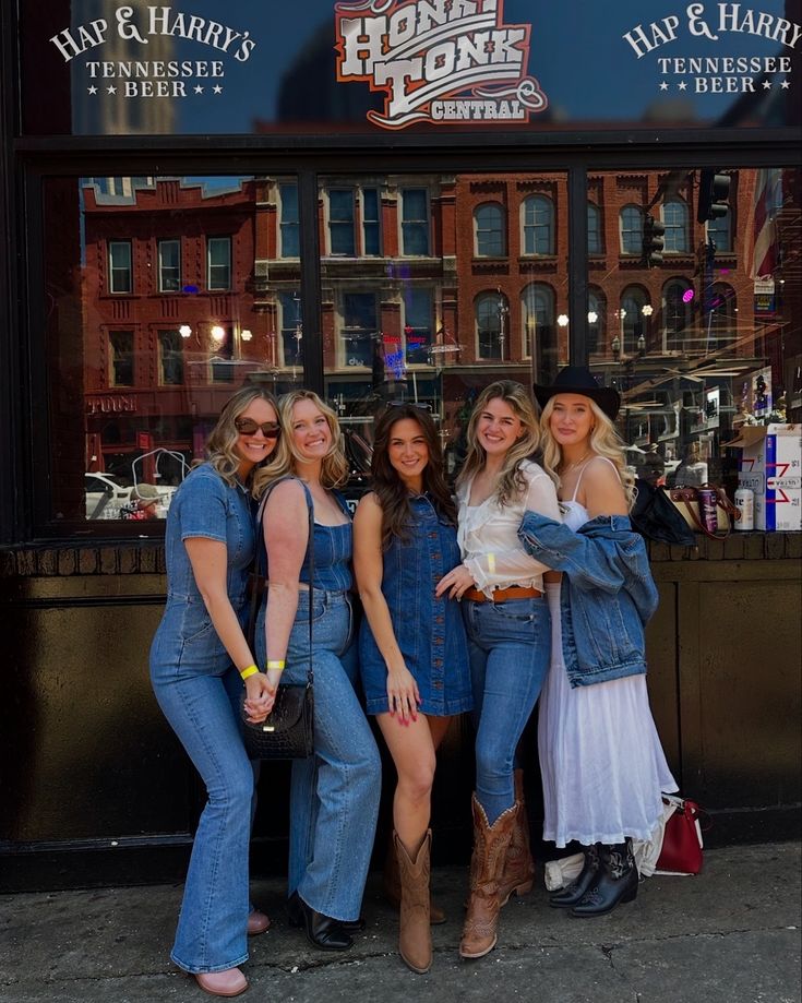 Honestly this group got it right. Every look works on its own but together the mix of denim jumpsuits, denim minis, button up denim dresses, white dresses with denim jackets reads so cohesively Nashville. The boots across the group tie it all together. If you are planning a group trip, you ought to suggest a loose denim theme and let everyone interpret it their own way like this.