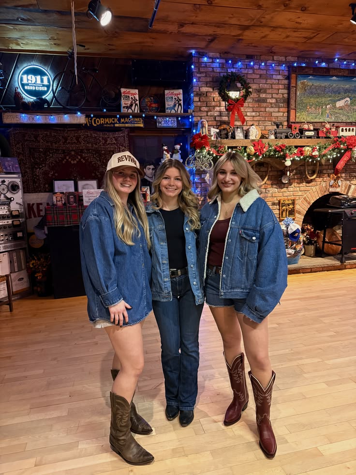 Denim jacket plus boots plus whatever you like underneath is basically the Nashville equation and these three prove it works at any styling level. From oversized Levi’s with a trucker hat to a fitted jacket with dark jeans to sherpa lined denim with shorts, each look is completely different in mood but the formula stays constant. So easy to copy, so effective every single time.