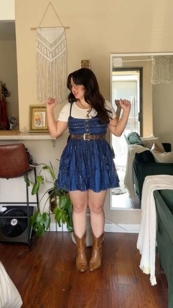 That blue tiered denim dress belted with a wide western buckle belt over a white tee, finished with tan cowboy boots? So fun, so Nashville. The belt completely transforms the dress and gives it that intentional rodeo ready shape. I mean without the belt it is a cute dress. With the belt it is a whole outfit. That is the power of the right accessory, honestly.