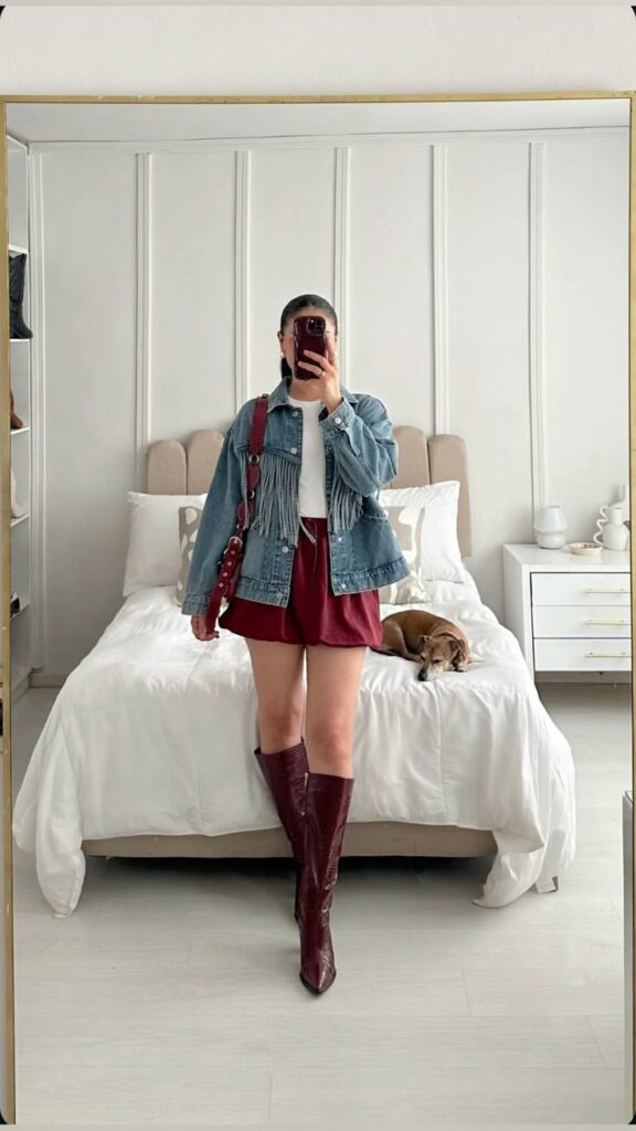 Burgundy on burgundy with a denim fringe jacket thrown on top? So intentional, so Nashville. The matching croc boots and bag in the same deep wine tone make this look so cohesive it almost feels like you planned it for weeks. Honestly you probably did and we respect it. This one is giving Broadway bar crawl energy from the moment you walk out the door.