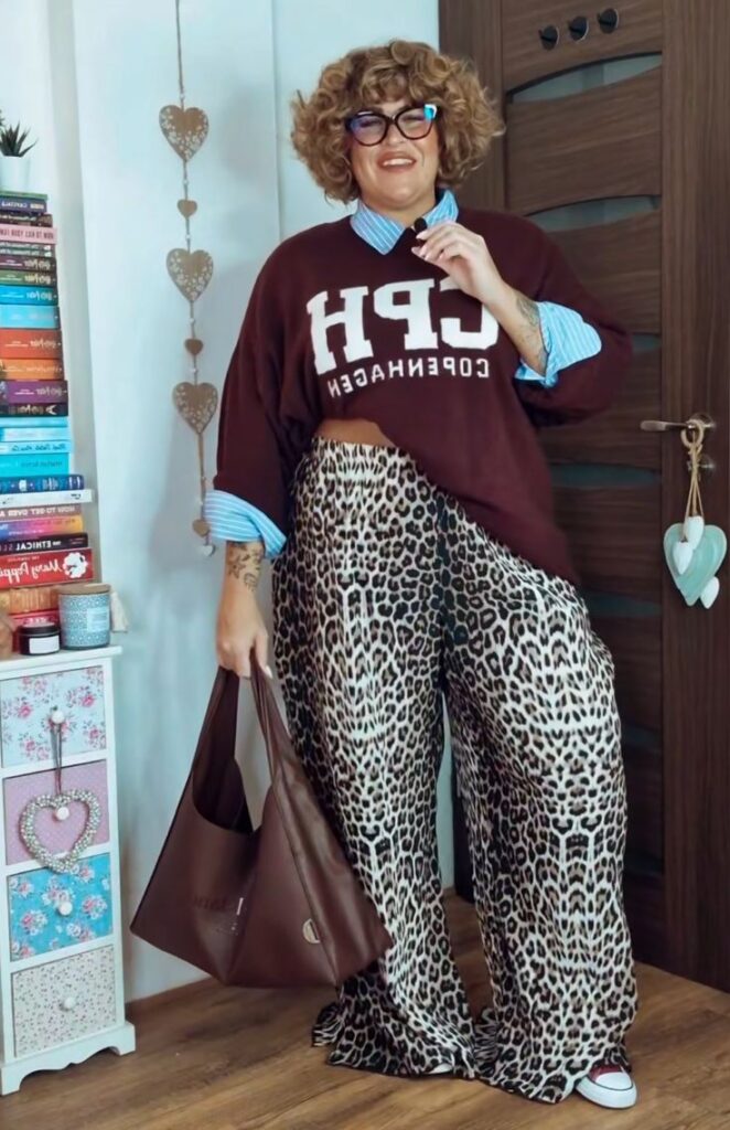 That oversized sweatshirt layered over a striped button down creates this really fun preppy meets casual vibe, and then those wide leg leopard pants?