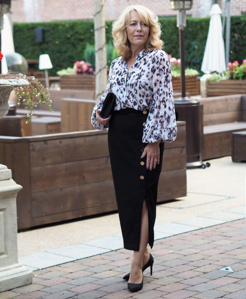 Here’s what makes this work so well. That leopard blouse is bold, but pairing it with a sleek black skirt keeps it sophisticated instead of costumey.