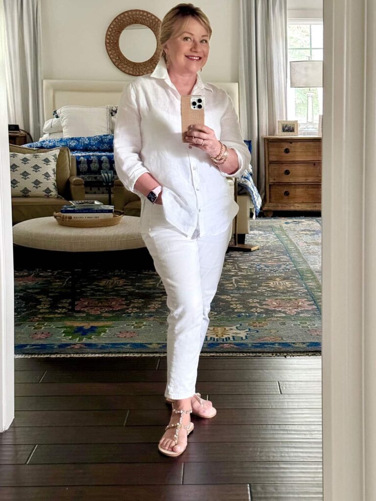 This button down shirt with matching white jeans creates this really clean, fresh look that feels both relaxed and polished at the same time.