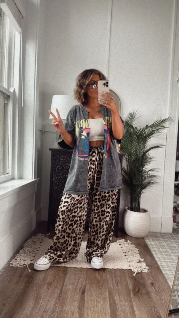 That oversized graphic tee gets elevated when you layer it under a slouchy cardigan, and then those leopard wide leg pants add the print element without feeling too matchy matchy with anything else.