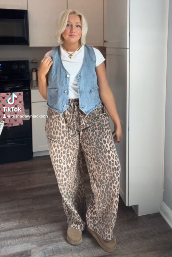 That denim vest over a basic white tee could be boring, but then you add those wide leg leopard pants and suddenly it’s a whole moment.