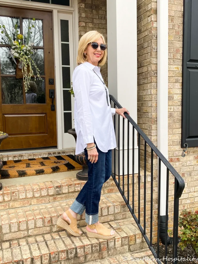 That crisp white button down with those slightly rolled jeans and platform espadrilles is basically the uniform of women who’ve figured out their style and stopped chasing trends.