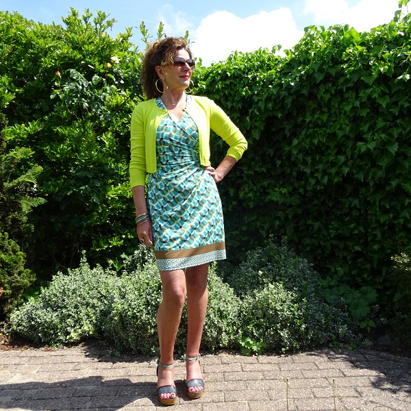 So this lime cardigan over a geometric print dress is not for the faint of heart, but honestly? That’s exactly why it works.