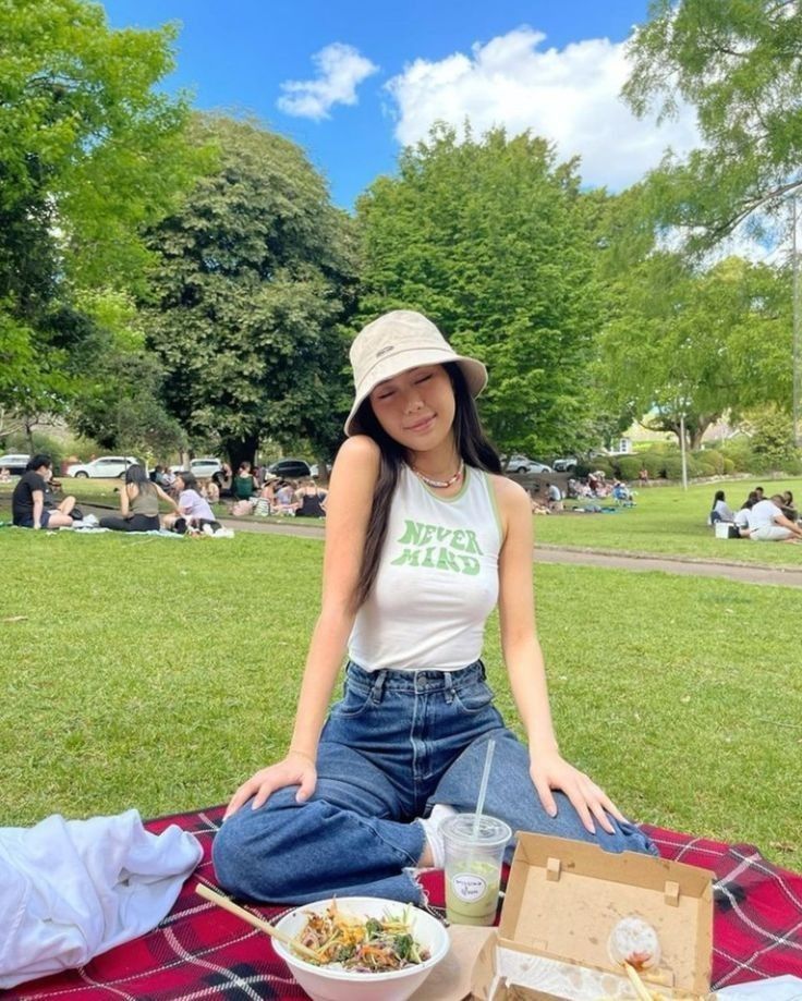 Graphic tank, wide leg jeans, a bucket hat. It’s so simple and so good. The “Never Mind” slogan tee actually works really well at a park because the whole thing feels relaxed and personality forward. Layer a beaded necklace and you’re done. Honestly this is the picnic outfit for the girl who doesn’t want to overthink but still wants her photos to look good.