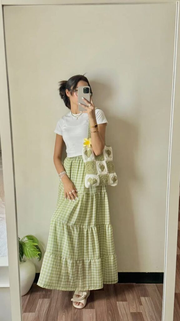 Nobody just throws this together, let’s be honest. White fitted tee tucked into a sage green gingham maxi skirt is so intentionally cute. That crochet heart tote is everything — it ties the whole look into a cohesive cottagecore moment. Style tip: tuck your tee just at the front to keep it looking polished without being stiff.