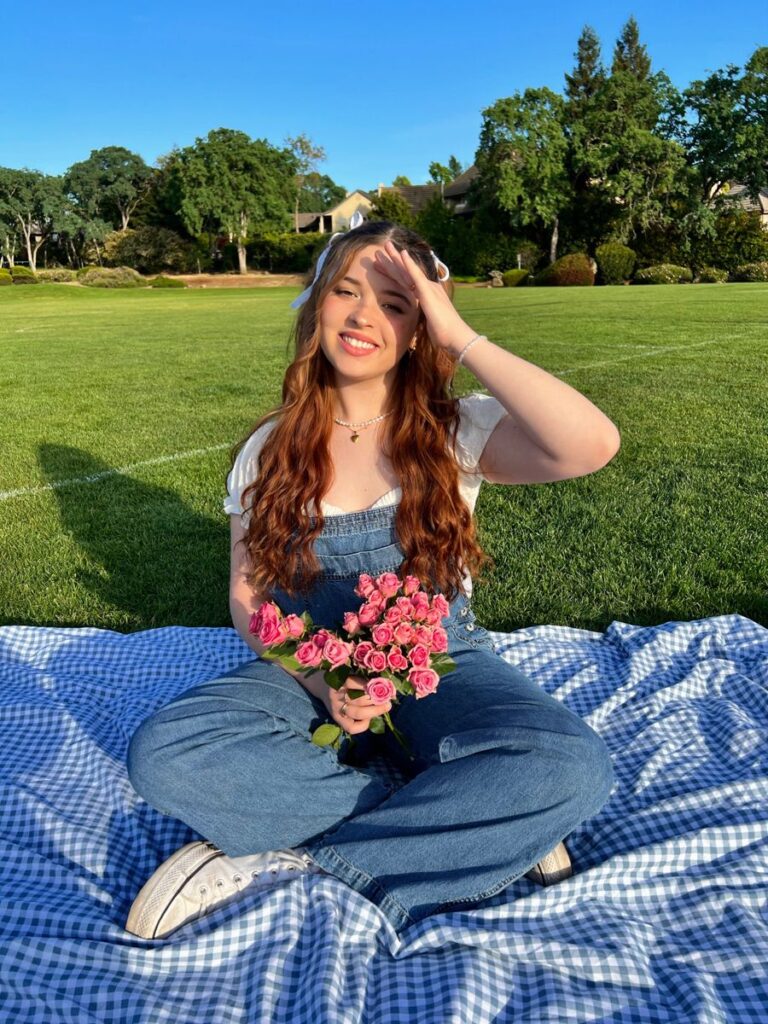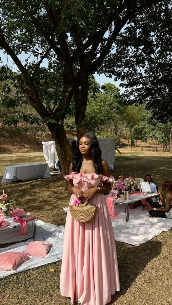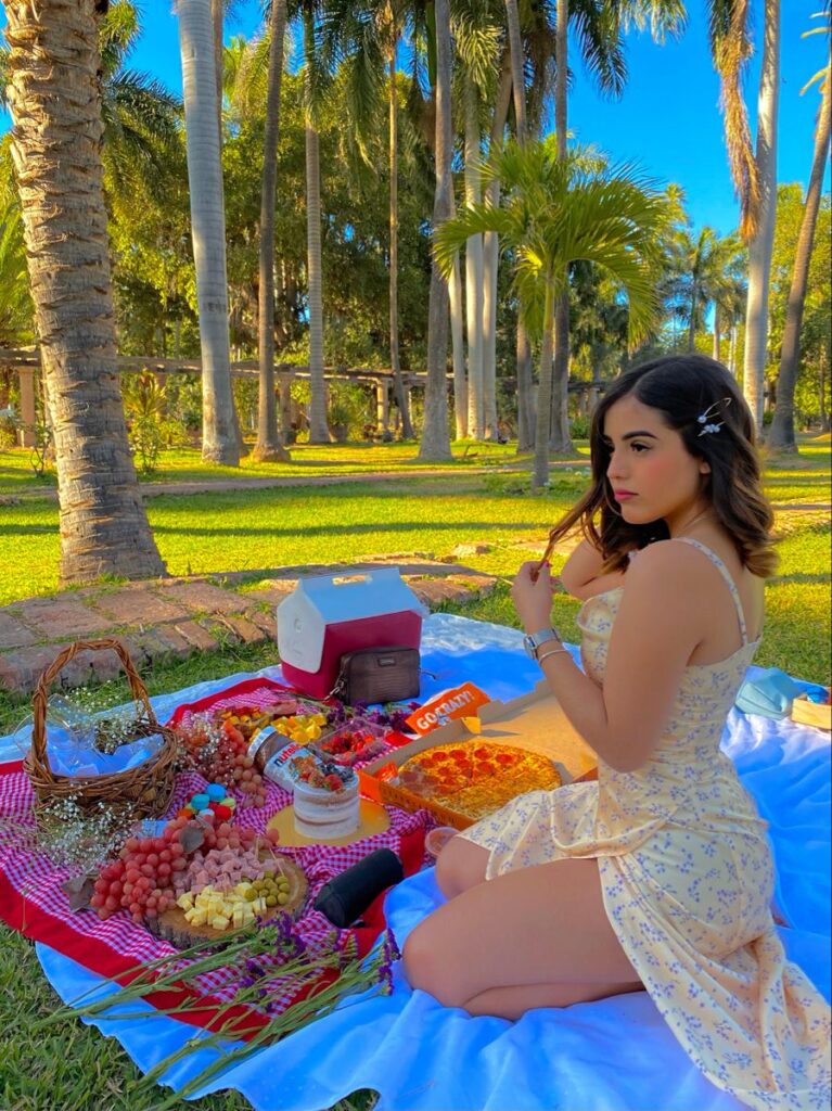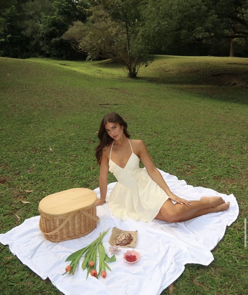 Clean and confident. The cream halter mini with simple floral detailing says she knows exactly what she’s doing. No accessories needed, no overthinking — just a beautiful dress and good energy. This works especially well if you want your picnic photos to feel editorial rather than posed. Honestly less is more and this look proves it every time.