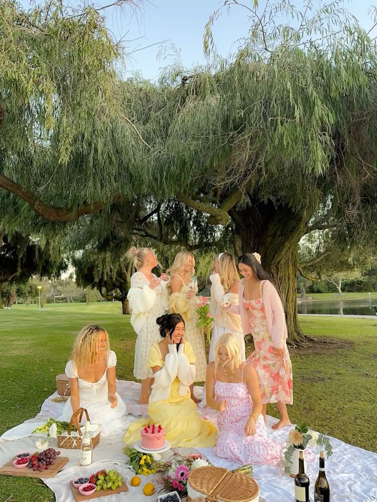 When everyone coordinates in the same soft pastel energy, the photos just look magical, so. Whites, creams, yellows and blush pinks all feel cohesive without being matchy matchy. If you’re planning a group picnic, suggest a loose colour theme like this and everyone gets to express their own style within it. The result is always stunning.