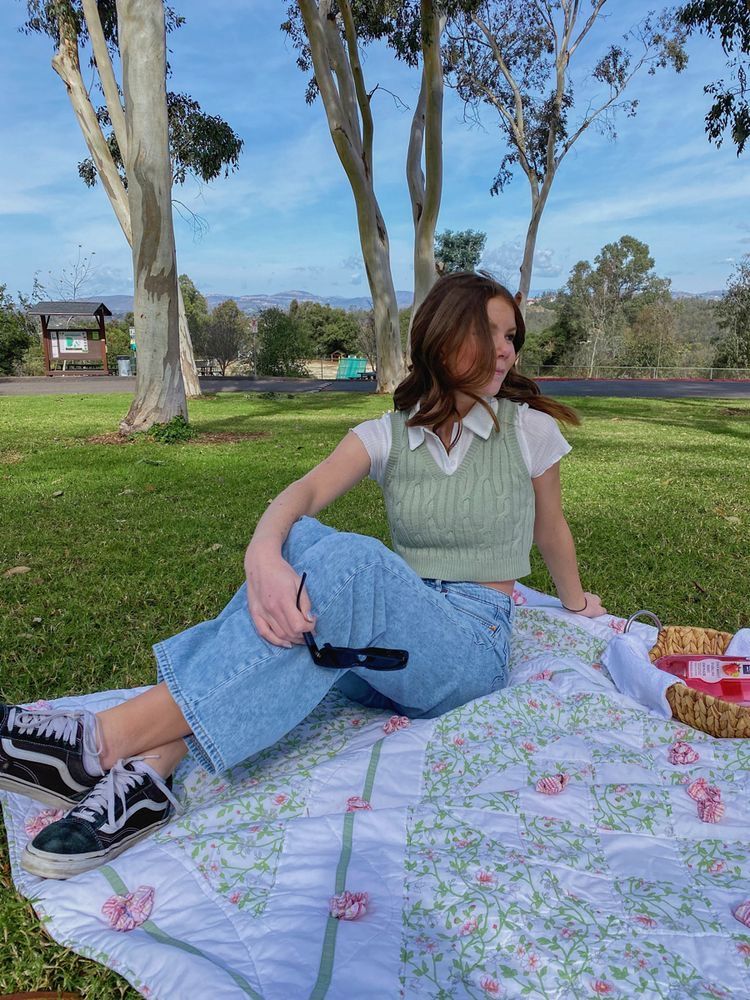 Cable knit vest over a white collared tee, wide leg jeans, Vans. Honestly this outfit has so much personality packed into something really simple. It’s the preppy picnic look that doesn’t feel try hard. The key is tucking loosely so it stays casual. This one works so well for a cooler afternoon when you still want to look intentional.