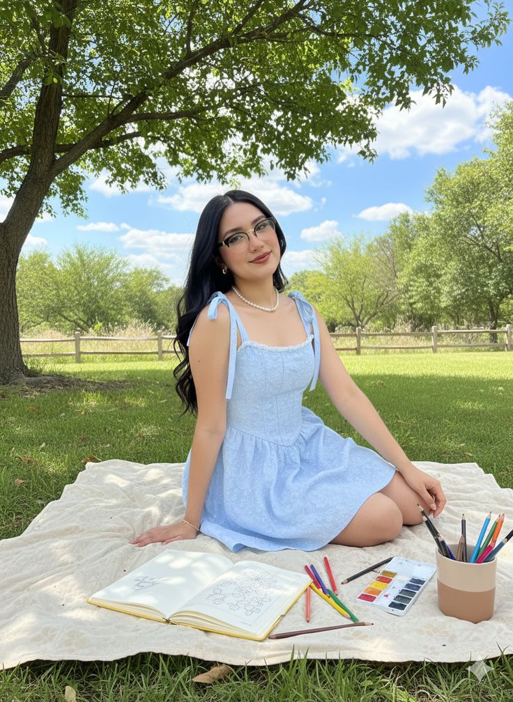 You know that girl who shows up to the park with a sketchbook and somehow looks amazing? This is that outfit. The baby blue tie shoulder mini dress with a pearl necklace is sweet without being over the top. Glasses add such a cute bookish touch. The whole vibe says creative afternoon outside and I mean that as the highest compliment.