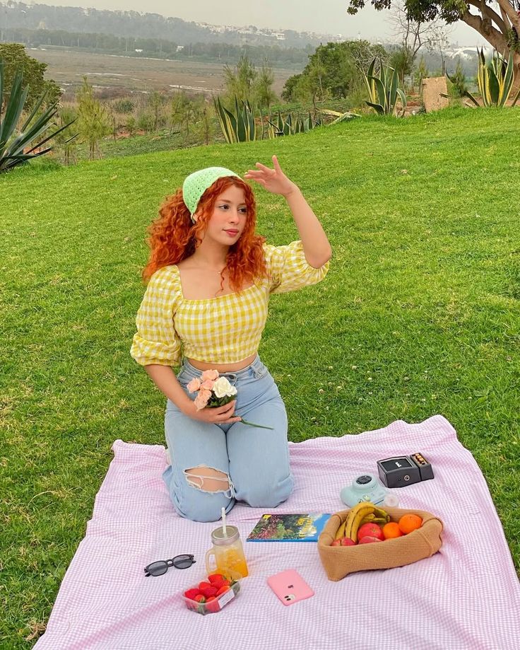 Honestly, this one just gets it. The yellow gingham crop top paired with wide leg jeans is so perfectly carefree, you know? That mint crochet headband is doing so much heavy lifting as an accessory. The whole look feels intentional without trying too hard. You ought to grab a headband in a contrasting colour like this — it basically upgrades any casual picnic outfit instantly.