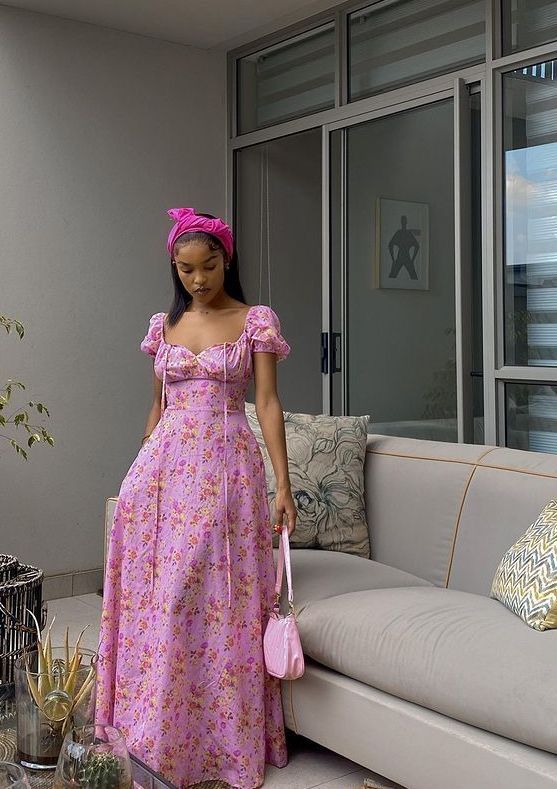 The puff sleeve floral maxi in lilac with the matching pink headband wrap is such a vibe. It’s bold, it’s romantic, it’s the kind of outfit people screenshot for inspo. The little pink mini bag is so cute as an accent. For anyone who wants to lean into the cottagecore aesthetic without going all the way rustic, this hits the sweet spot perfectly.