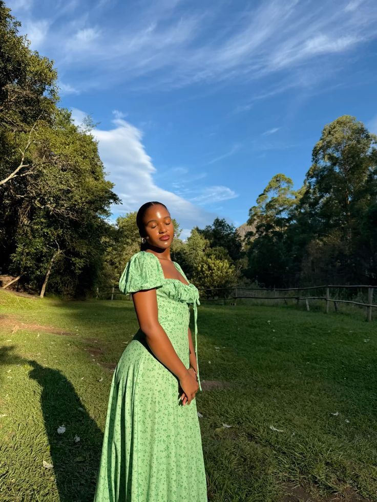 Mint green floral midi dress with puff sleeves and a sweetheart neckline against golden hour light? This is genuinely one of those looks that stops people mid sentence. The silhouette is so flattering and romantic. If you want one dress that works for an outdoor picnic, a garden party or honestly just existing beautifully outside, this is the one to invest in.