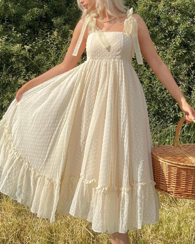 This is genuinely so pretty it’s almost unfair. The cream swiss dot dress with bow tie straps hits every single cottagecore note perfectly. Wear it barefoot in a field, carry a wicker basket, and you’re basically living in a novel. Style tip: stack your necklaces so the neckline stays interesting since the dress does most of the visual talking anyway.