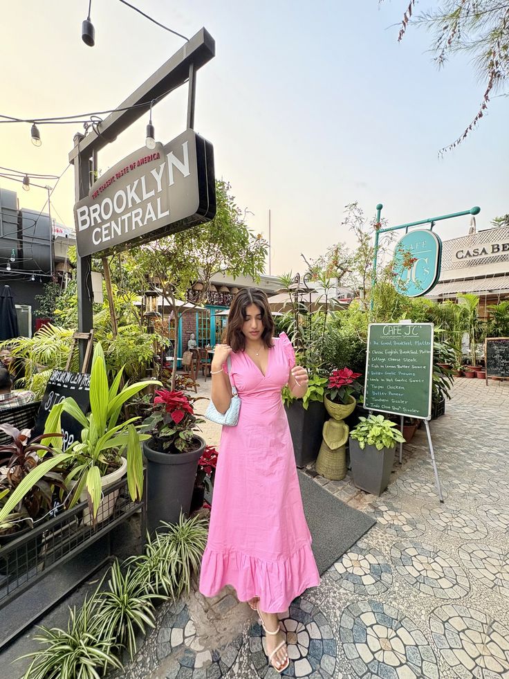This is the outfit you wear when you want everyone at the café to wonder who you are. That hot pink midi dress against all the greenery is just chef’s kiss. The powder blue quilted bag keeps it from going over the top. Basically, if you own a dress this colour, you need to take it outside immediately. It was made for natural light.