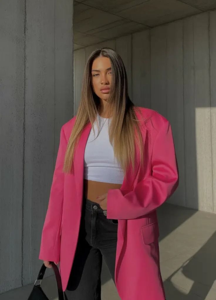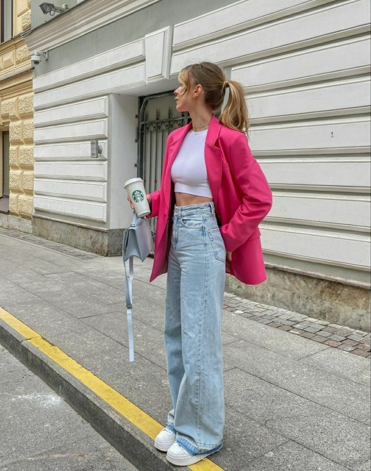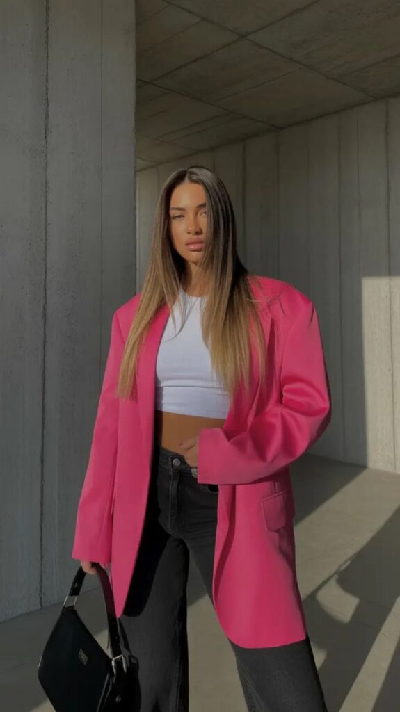 The hot pink oversized blazer with a white crop top and grey straight jeans is one of those combinations that looks like it took five minutes but photographs like it took an hour. The black shoulder bag grounds all that bright colour without being boring. I mean honestly if you own a hot pink blazer and you have not tried this yet, what are you actually doing.
