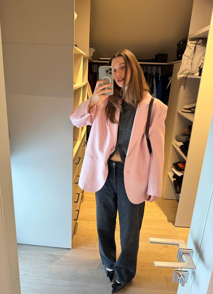 Pairing a soft baby pink blazer with grey denim and a dark knit underneath is such an unexpected colour combination that honestly should not work as well as it does. The contrast between the rosy blazer and the moody grey tones creates this cool effortless tension. Black logo shoes finish the look with a quiet flex. Sometimes the best pink blazer outfits are the ones that basically ignore the obvious choices entirely.