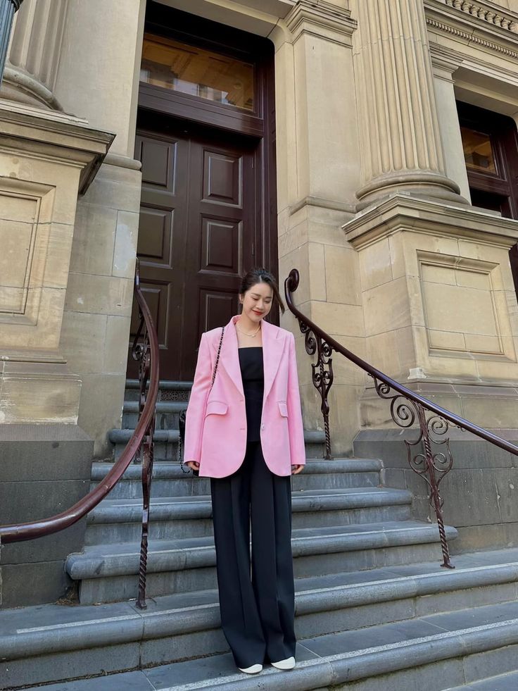 Standing on grand stone steps in an oversized pink blazer over a black spaghetti top and wide black trousers with two tone pointed flats is genuinely such a cinematic pink blazer outfit moment. The all black underneath lets the blazer take full centre stage without any competition. This is for the person who wants their casual look to feel like it belongs somewhere more important than wherever they actually are.