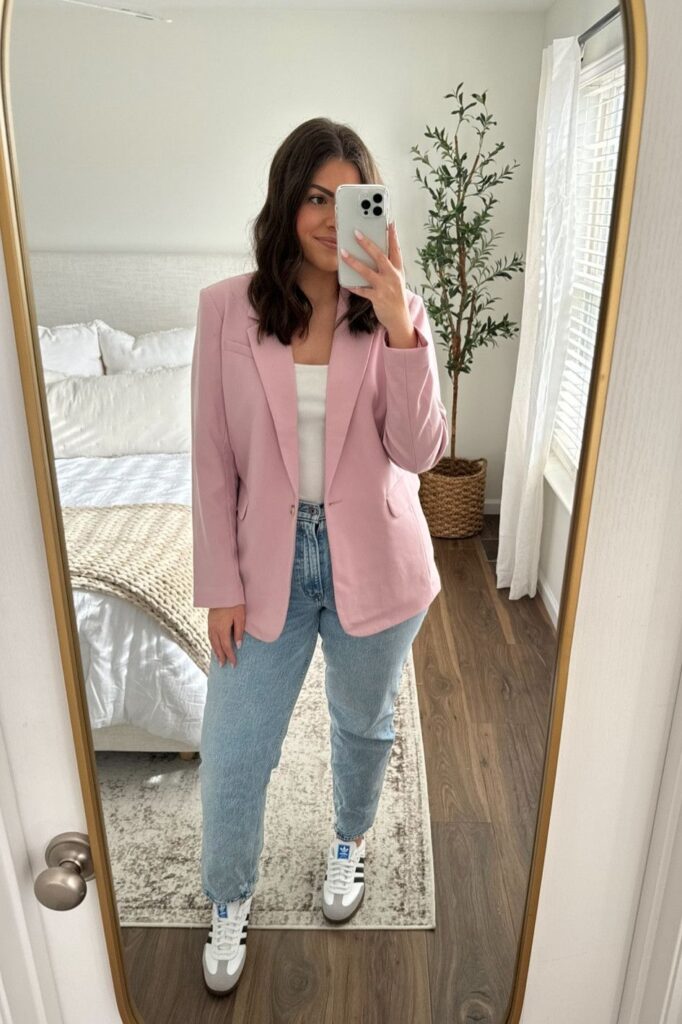 Dusty pink blazer, white square neck top and light mom jeans with white Adidas Sambas is such an easy and genuinely cute combination. The trainers make it feel young and approachable rather than too polished. So if you have ever thought pink blazers only work with heels, this is proof that sneakers are sometimes the better call. Honestly the better call most of the time.