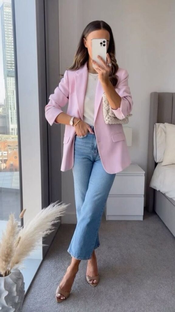 Light pink blazers and light wash straight jeans are honestly one of the most reliable pink blazer outfit combinations going. The cream crochet bag is what takes this from standard to genuinely charming though. Nude heeled sandals finish everything without competing. You ought to roll the sleeves up slightly and keep jewellery minimal, the bag is doing enough personality work for the whole look.