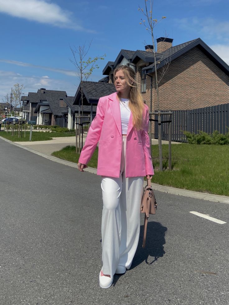 All pink everything on a bright day is a power move and this pale pink double breasted blazer over wide white trousers and a white tee with white platform shoes proves that same tone dressing absolutely works. The peachy bag is a clever little break in the palette that stops everything from blending together too completely. Just walk like you know exactly where you are going and this whole look lands.