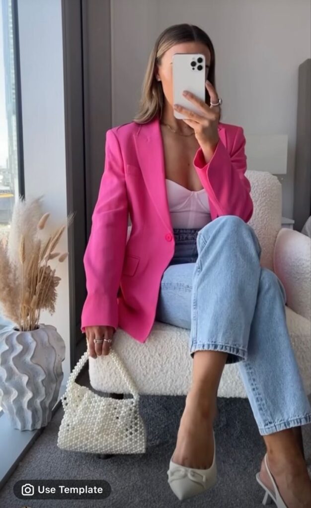 Honestly the hot pink blazer over a white corset top with light wash jeans is one of those combinations that walks into a room before you do. The pearl bag and bow heels soften the boldness just enough without diluting any of the impact. If you have been sitting on a statement blazer waiting for the right moment, I mean, this is literally it. Just wear it.