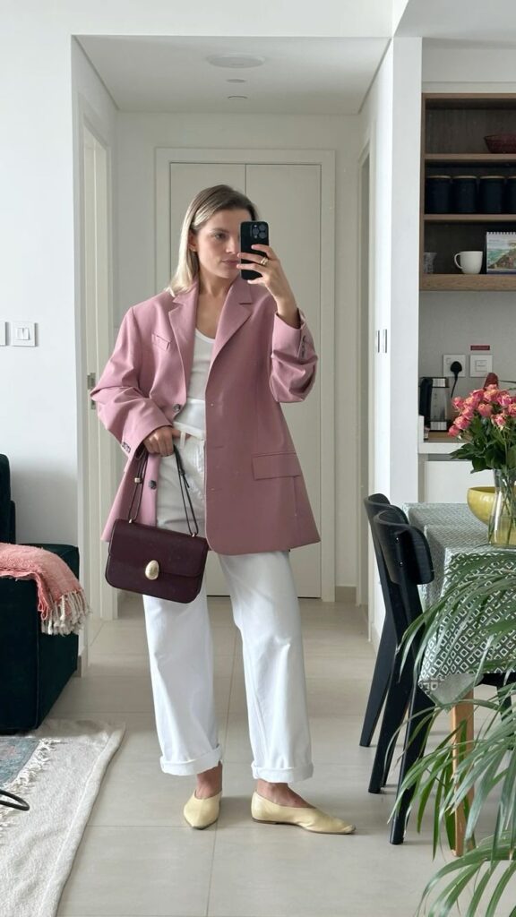 A dusty mauve pink blazer over a white vest and rolled white straight jeans is such an understated combination that the deep burgundy bag just completely transforms. That colour contrast between the warm pink and the rich dark bag is so unexpected and so good. Yellow ballet flats add a playful touch that keeps the whole look from feeling too serious. This is the pink blazer outfit for people who like looking intentional without looking like they tried.