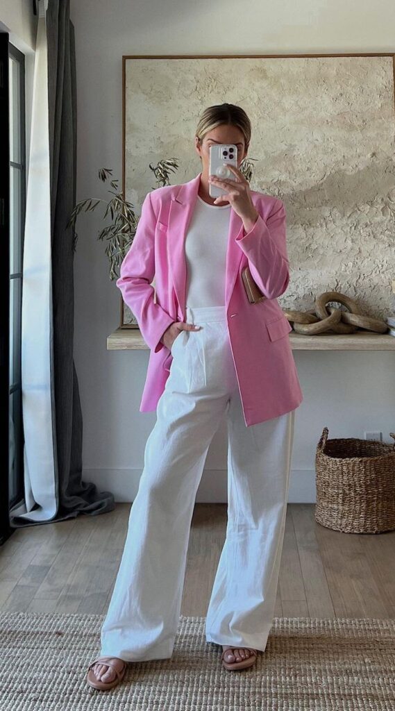 White wide leg trousers and a white tank are such a clean canvas and the blush pink blazer thrown over the top is genuinely all it needed. The flat sandals keep it relaxed enough for daytime while the whole look still reads as intentional and put together. So if you usually reach for a neutral jacket, try this instead and see how much more interesting the whole outfit becomes.