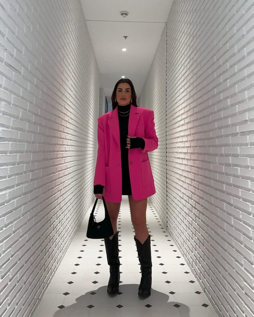 Hot pink longline blazer worn as a dress over a black turtleneck and black mini with knee high cowboy boots is such a dramatic and genuinely cool pink blazer outfit idea. The contrast between the neon pink and the all black underneath creates this striking visual that works so well in editorial settings. Hoop earrings and a chain necklace add the right amount of attitude. Basically this look does not need an occasion, it creates one.