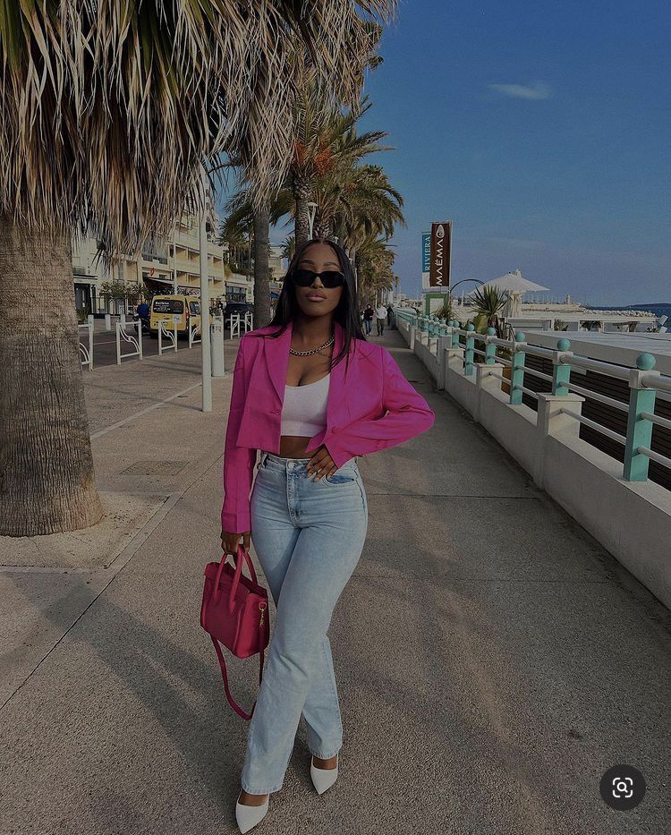 Cropped hot pink blazer over a white bralette with light high rise jeans and white pointed heels is so summer vacation main character. The matching fuchsia bag is an intentional choice that could have easily been too much but somehow lands perfectly because the rest of the look stays so clean and simple. So if you have an upcoming trip somewhere warm and sunny, you ought to build this exact outfit immediately.