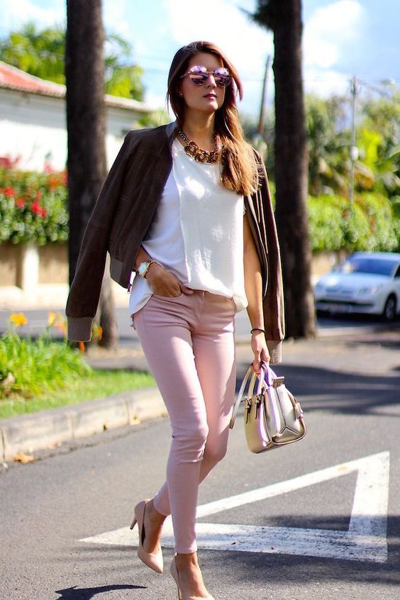 When I want to refresh my denim game, I reach for pink pants paired with a chambray shirt. The soft pastel pink pops beautifully against the cool, textured blue of chambray, creating a fresh and casual vibe that feels both playful and polished. I love rolling up the sleeves and adding white sneakers for a laid-back look. Try this combo with simple gold accessories to keep it light and stylish.