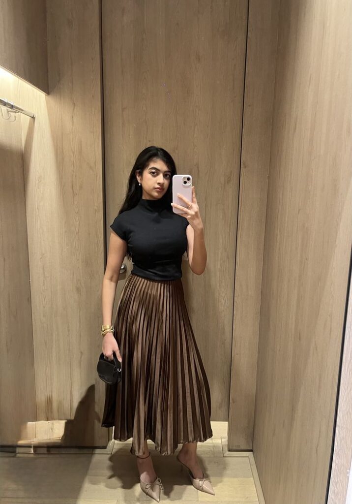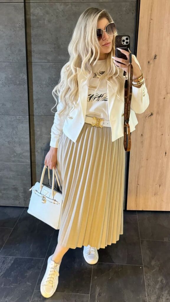 The simplest outfits sometimes photograph the best. A black fitted tee half tucked into a cream pleated midi with white sneakers and a nude crossbody is clean, minimal and genuinely elegant. That delicate silver coin necklace is the only jewellery you need. Honestly this combination works because the contrast between the dark top and the pale flowing skirt creates such a good visual balance.