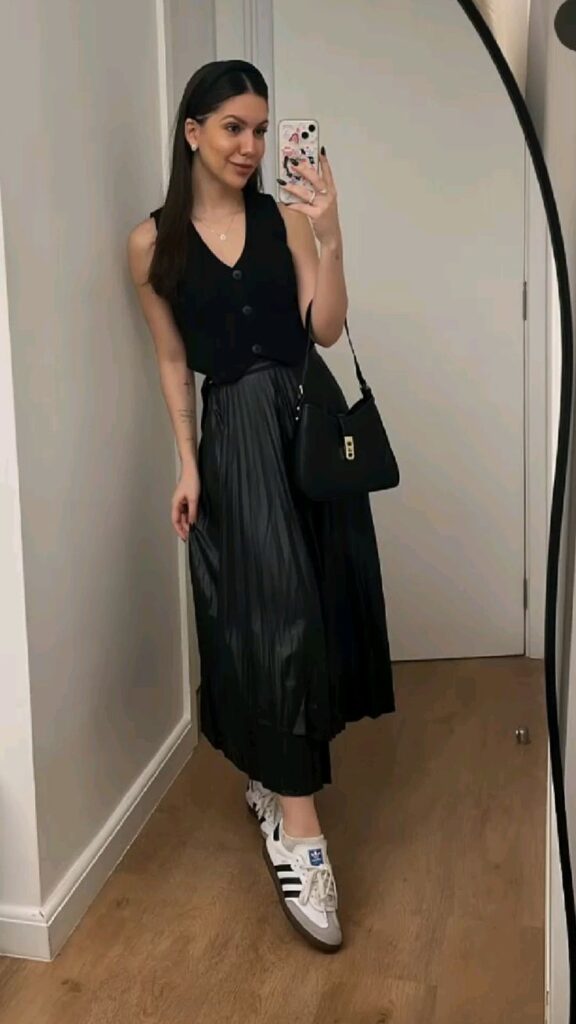 The fitted black button front vest layered over a glossy black pleated midi with Adidas Sambas and a sleek black shoulder bag is such a considered all black moment. The texture difference between the matte vest and the shiny skirt is what keeps it interesting. I mean it would be easy for all black to look flat but the mix of fabrics prevents that entirely. A thin gold necklace is the only detail you need.