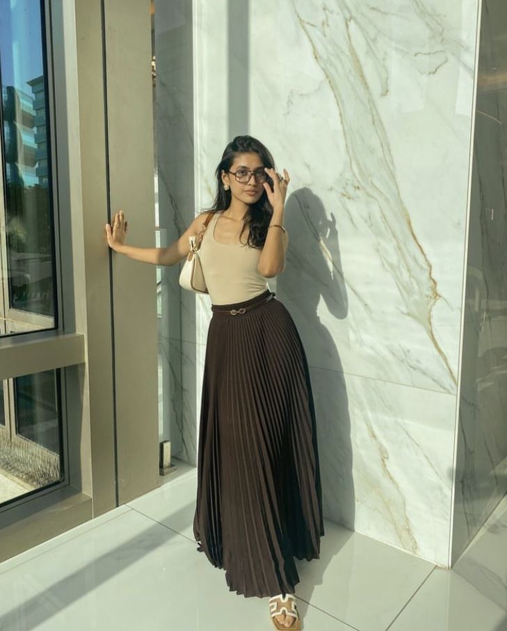 For maximum elegance with minimum effort this is it. A simple nude ribbed tank tucked into a deep chocolate brown pleated maxi skirt with a gold horsebit belt, a cream shoulder bag and white slides is so refined. The tonal warmth of the camel belt bridging the nude top and brown skirt is such a clever colour transition. The glasses add personality. Genuinely one of the chicest looks in this guide.