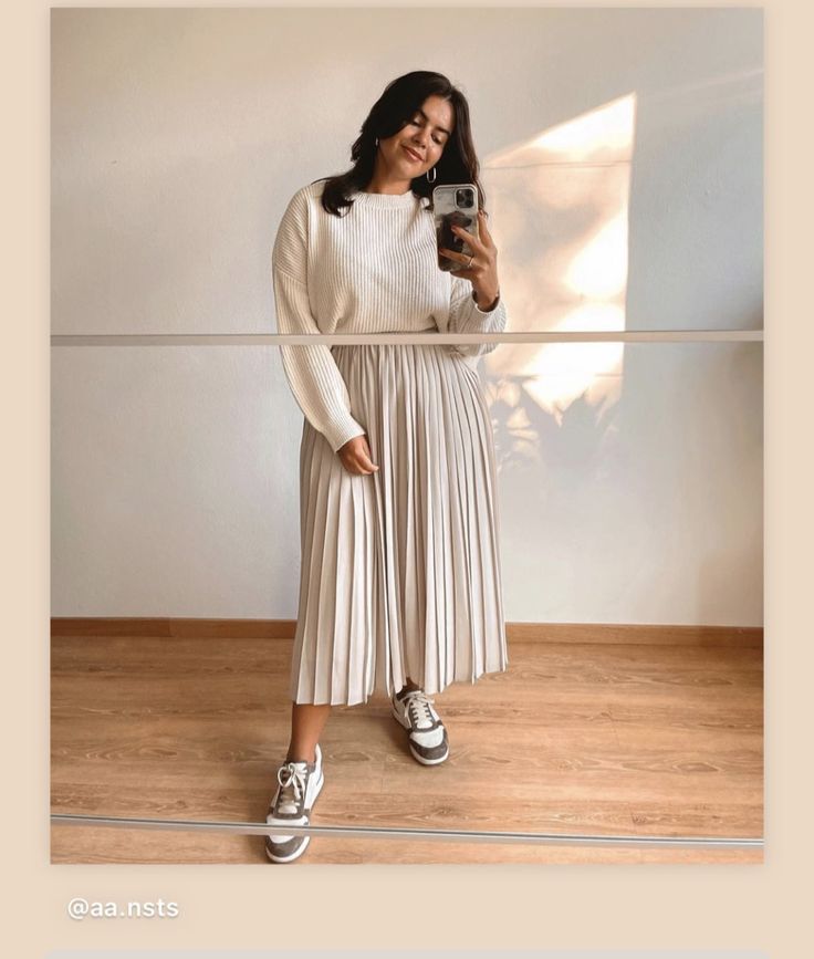 All ivory tonal dressing in a ribbed knit sweater and a pleated midi skirt is the kind of outfit that looks effortless but is actually very considered. The warm taupe trainers are the key detail here because a stark white shoe would break the softness of the whole palette. Small hoop earrings and nothing else. This works beautifully for cooler mornings when you want warmth without sacrificing style.