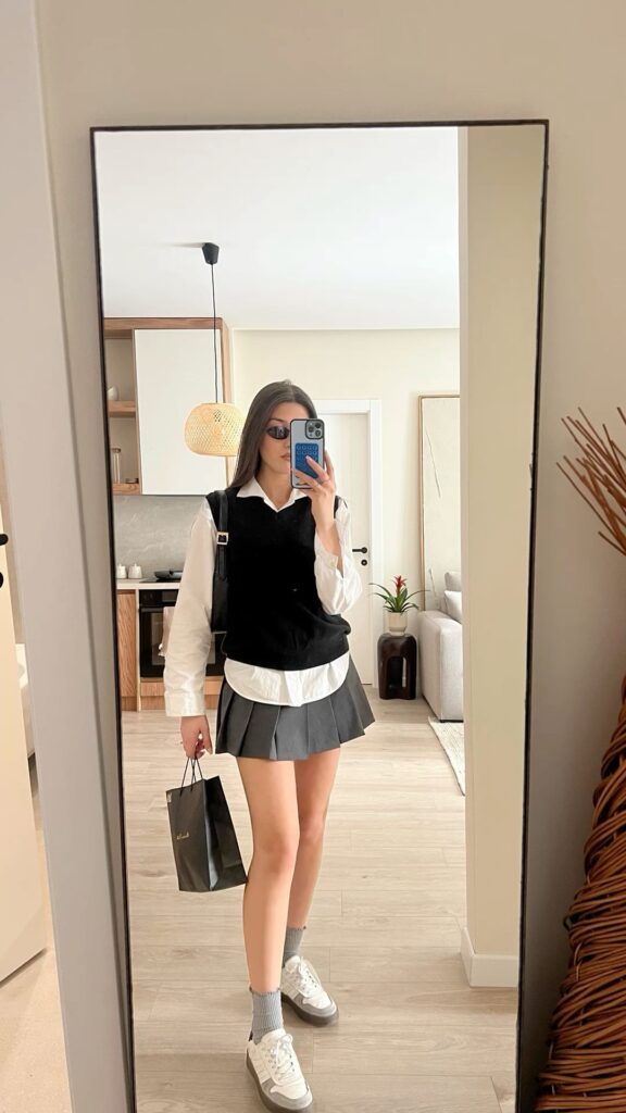 Layering a black V neck knit vest over a white button down shirt with a grey pleated mini skirt, grey crew socks and retro trainers is giving very elevated school uniform and I mean that as a compliment. The layering adds depth and keeps the look interesting. This works so well for creative campuses, casual Fridays or any day when you want to look intentionally cool rather than accidentally casual.