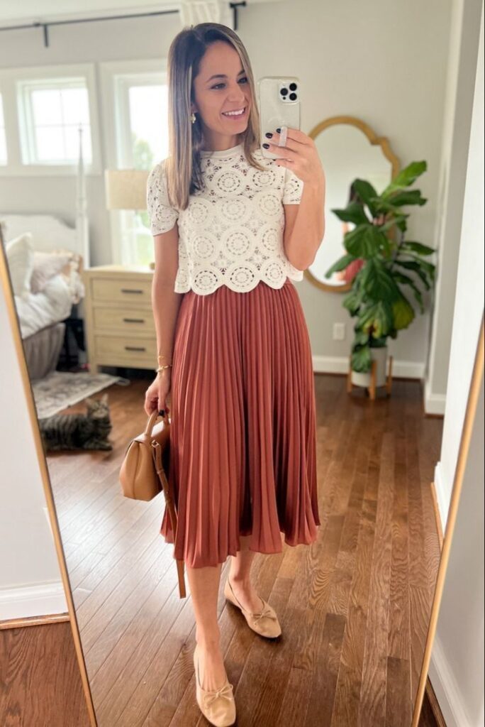 The white crochet scallop edge top over a rust terracotta pleated midi with nude ballet flats and a tan structured bag is so feminine and spring ready. The handcraft detail of the crochet against the smooth pleated fabric creates such a lovely textural contrast. Pearl earrings and a relaxed wave in the hair and you are genuinely done. This is the outfit for garden parties, brunches and anywhere the light is golden.